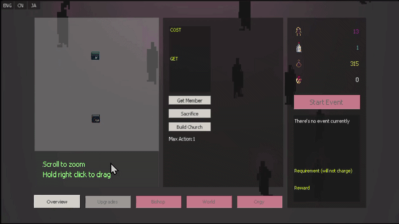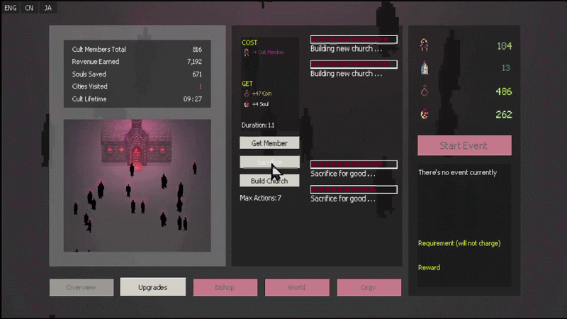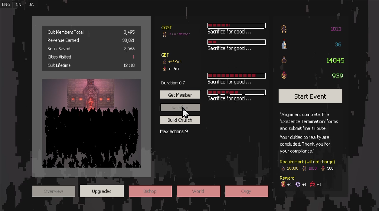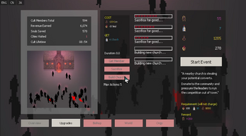 - Upgrade tree: Upgrade your cult to be the most optimized organization in the world!